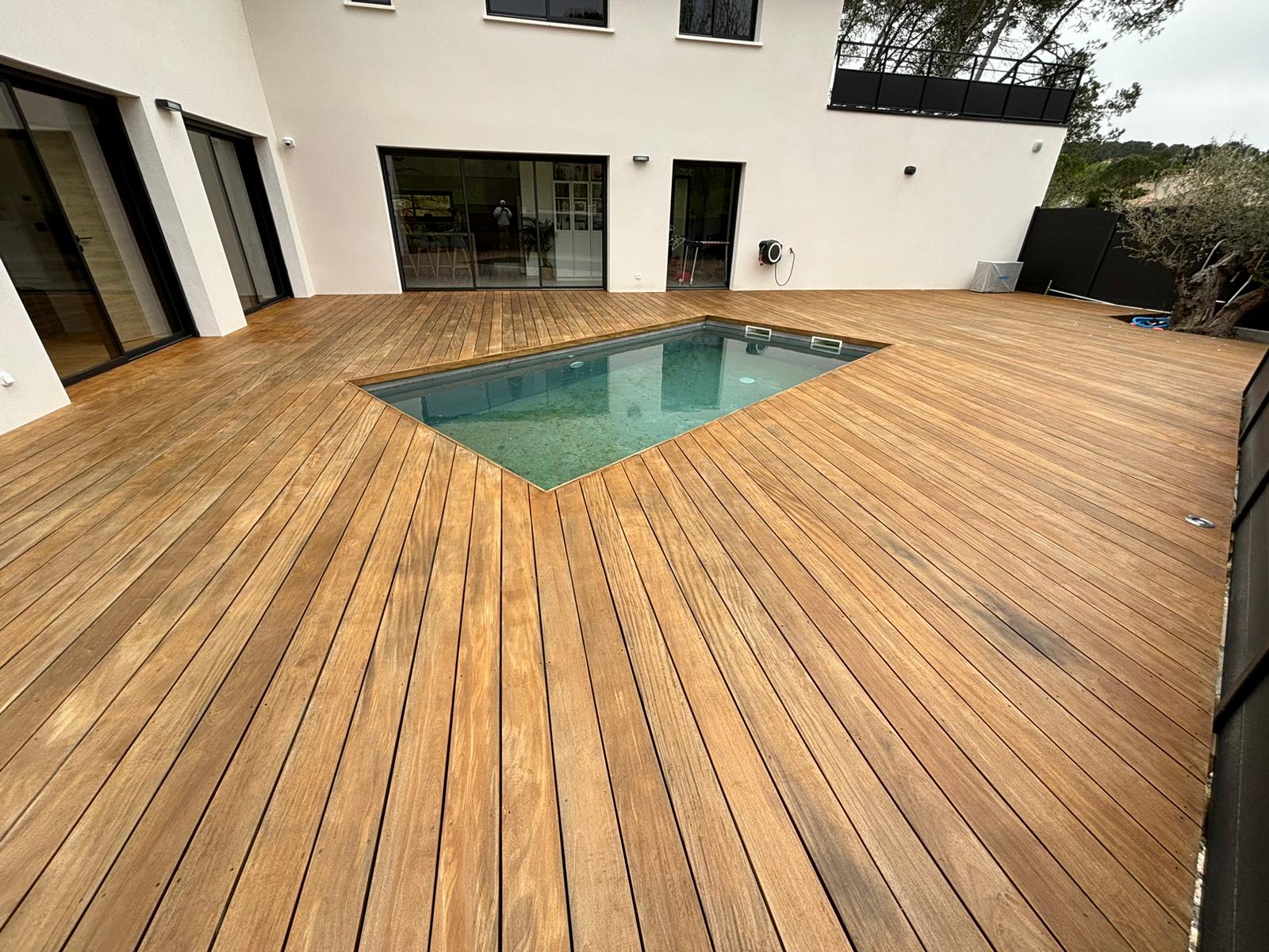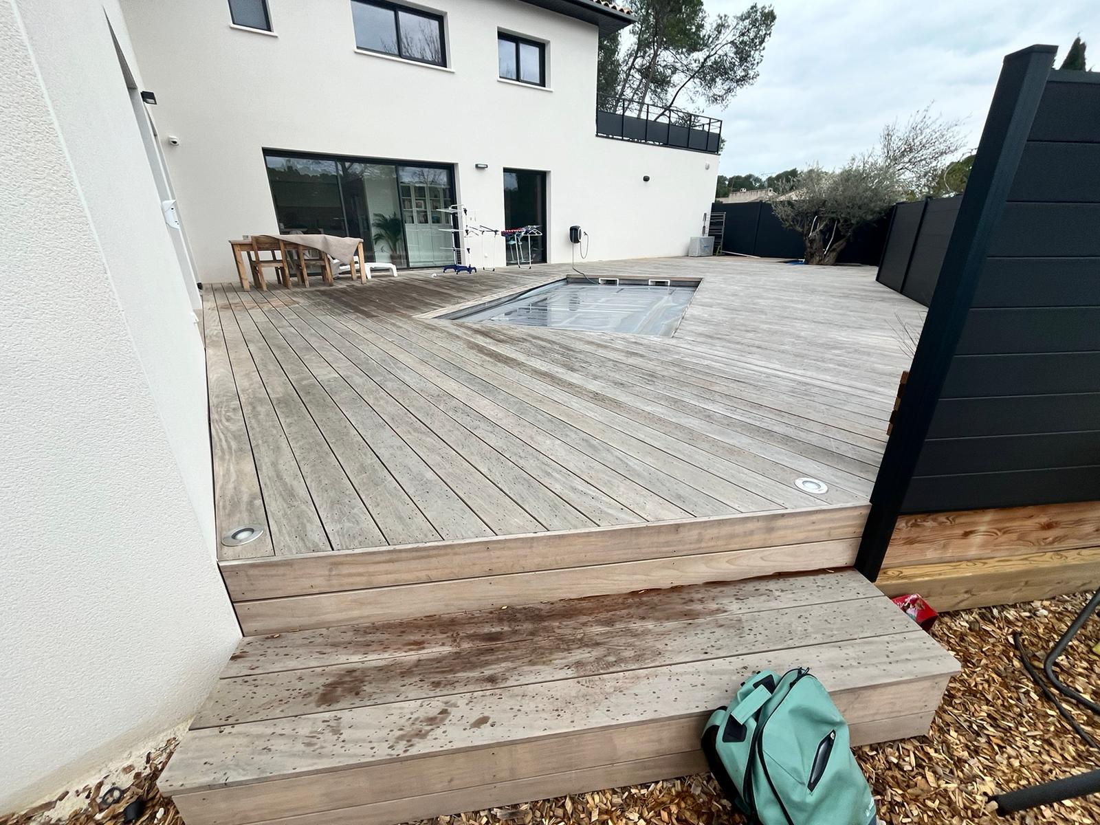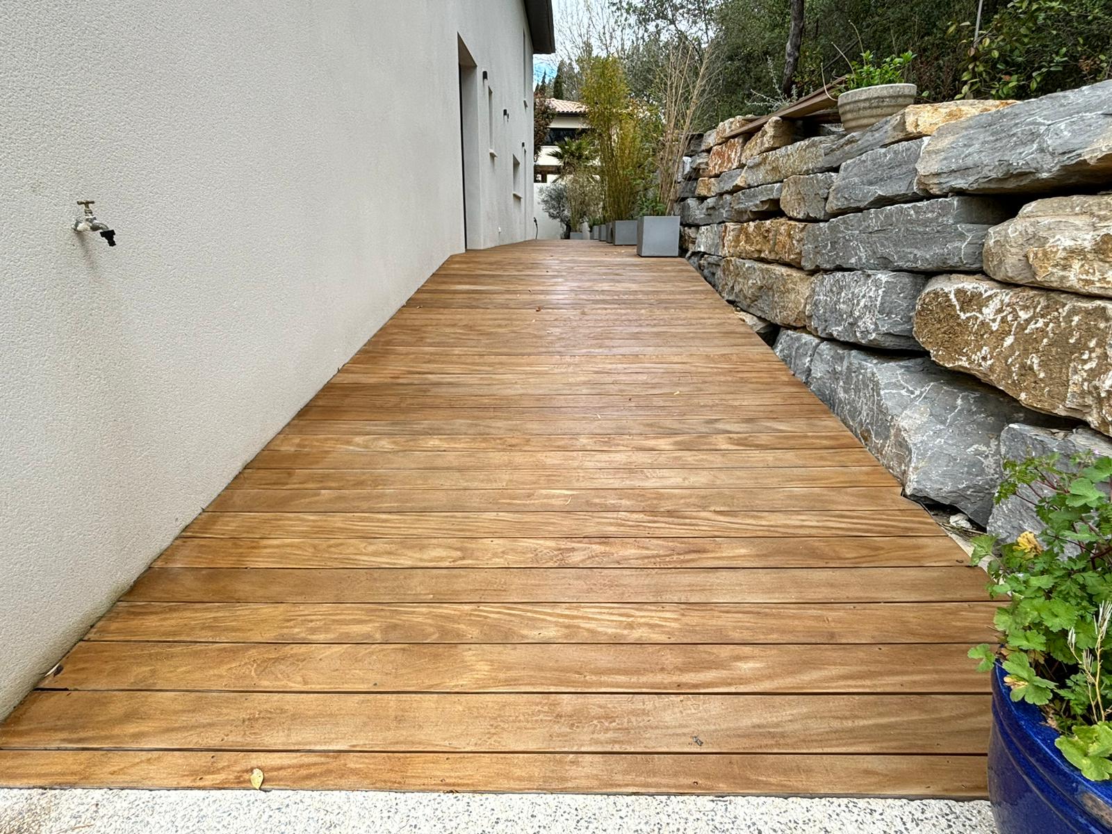 Sur cette réalisation, nous sommes intervenus pour le nettoyage et l’entretien d’une terrasse en bois exotique ayant perdu de son éclat avec le temps.