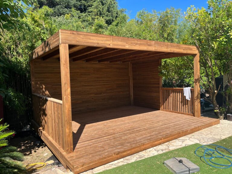 Réalisation d’une terrasse bois surélevée avec abri de pool house à Lunel-Viel
