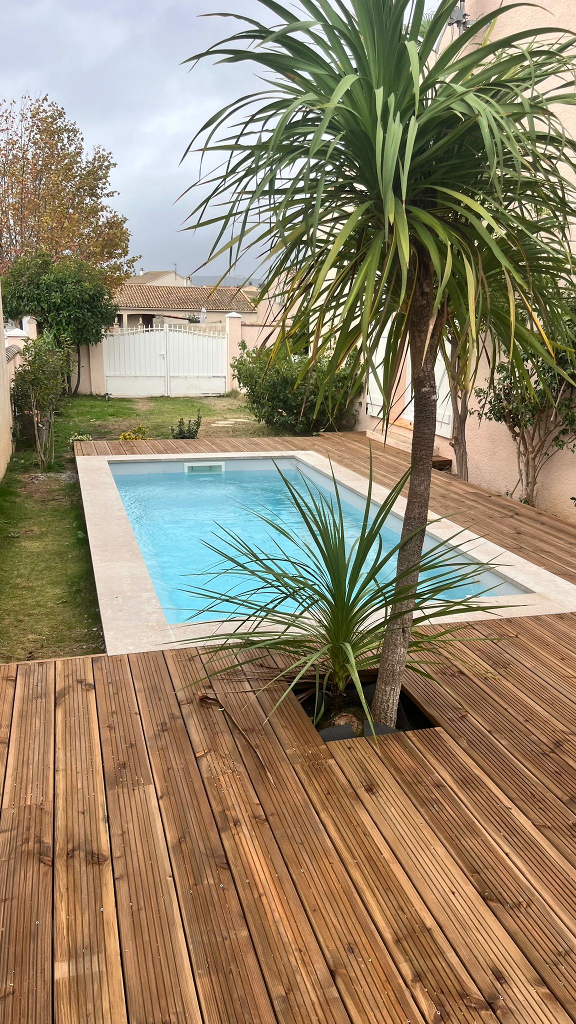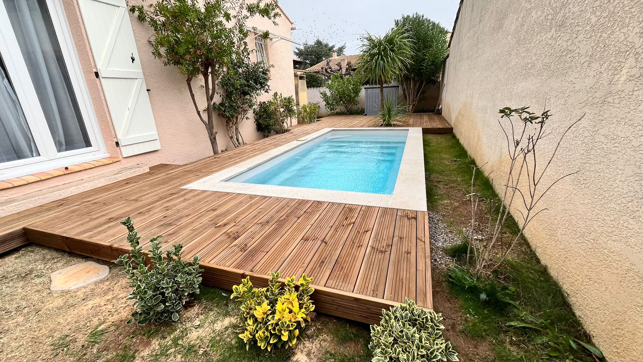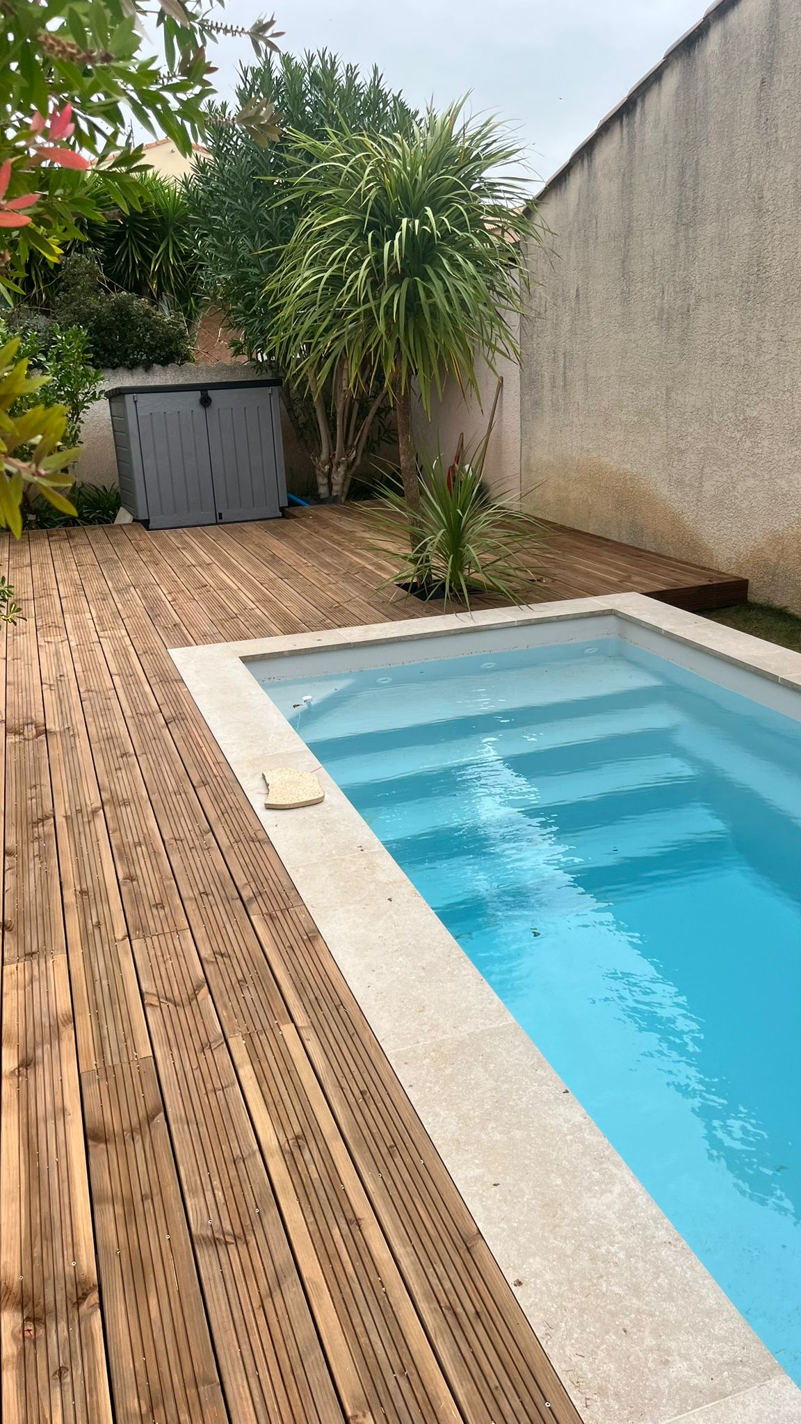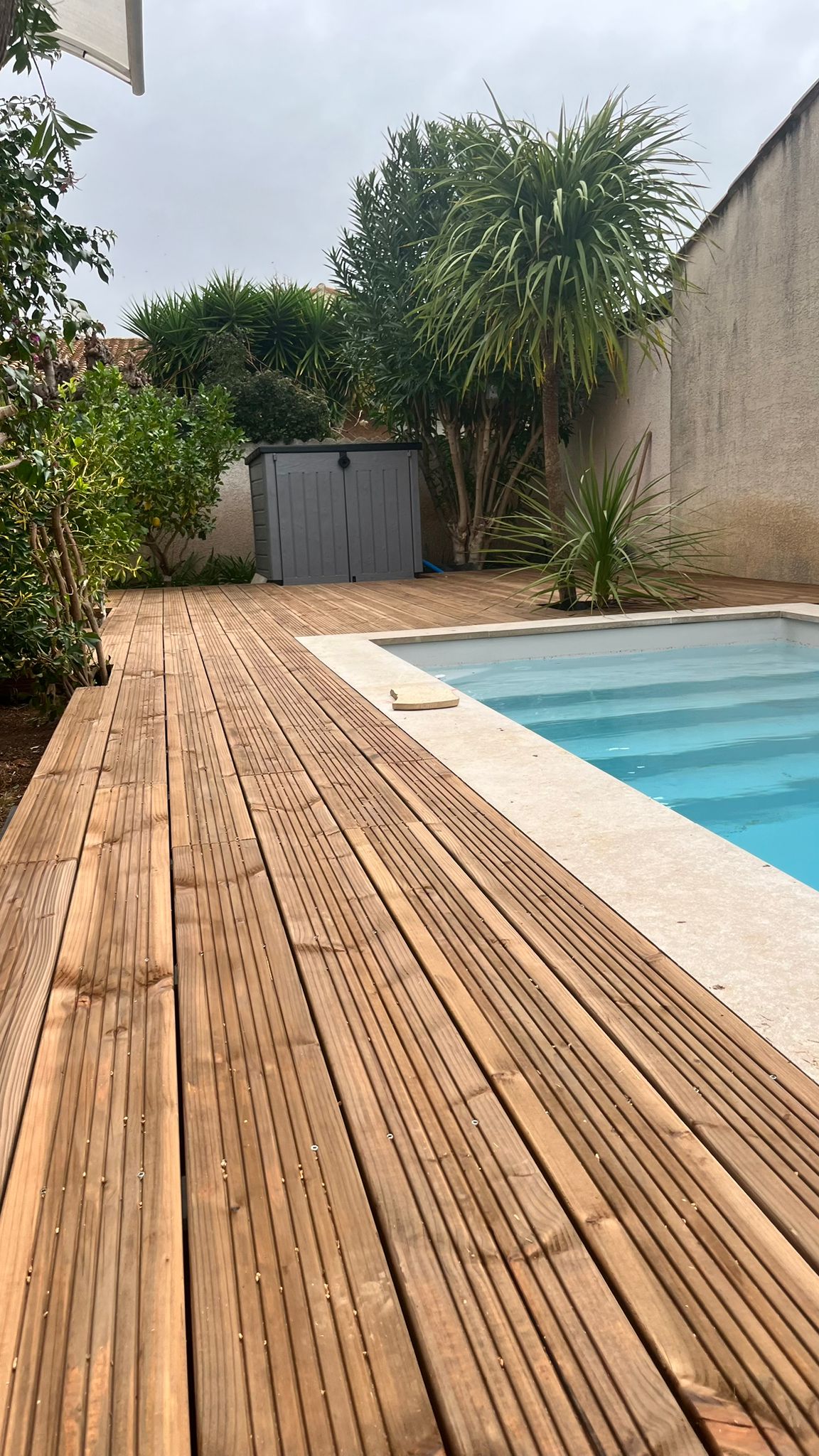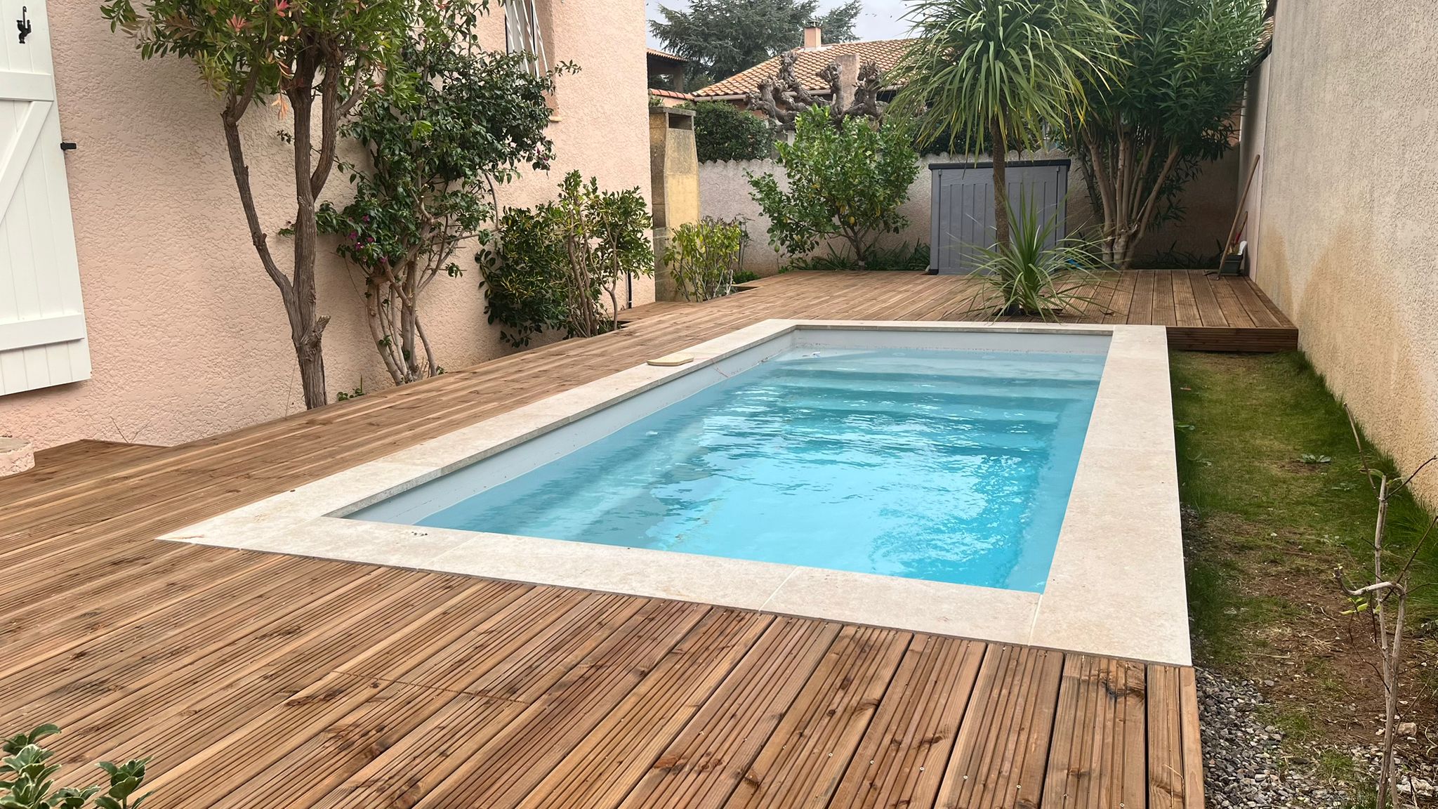 - la margelle de piscine en travertin : elle vient structurer les abords et créer une transition élégante entre la terrasse bois et les autres espaces extérieurs.