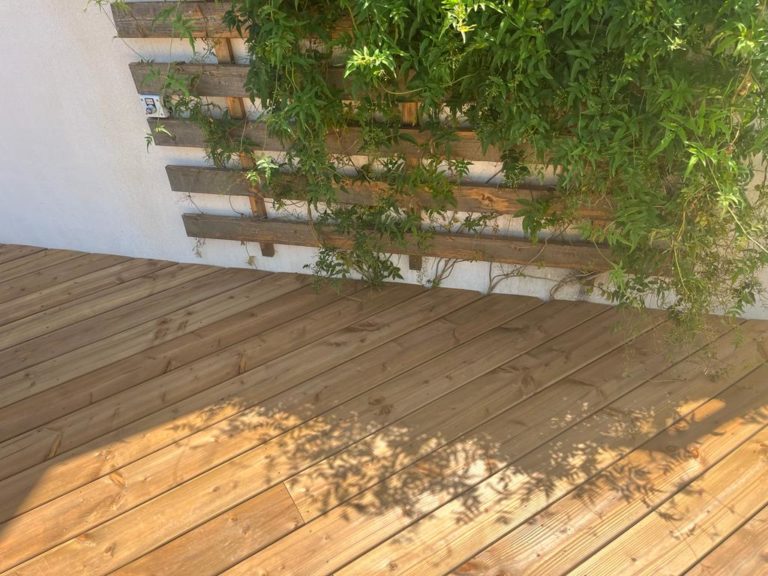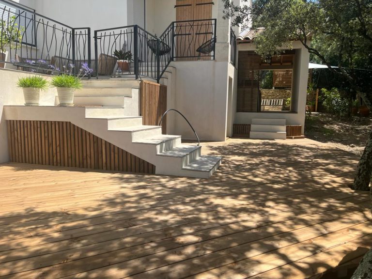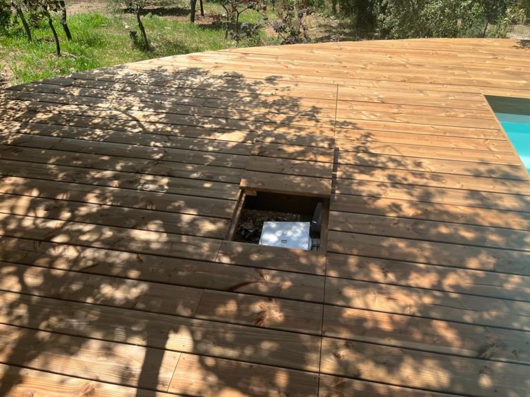 Notre équipe est fière de cette belle terrasse en pin Douglas de 100 mètres carrés, réalisée à Junas en juillet 2023. Nous avons également réalisé un bardage claire-voie pour la douche, et pour le coffre de volet piscine intégré sous la terrasse.
